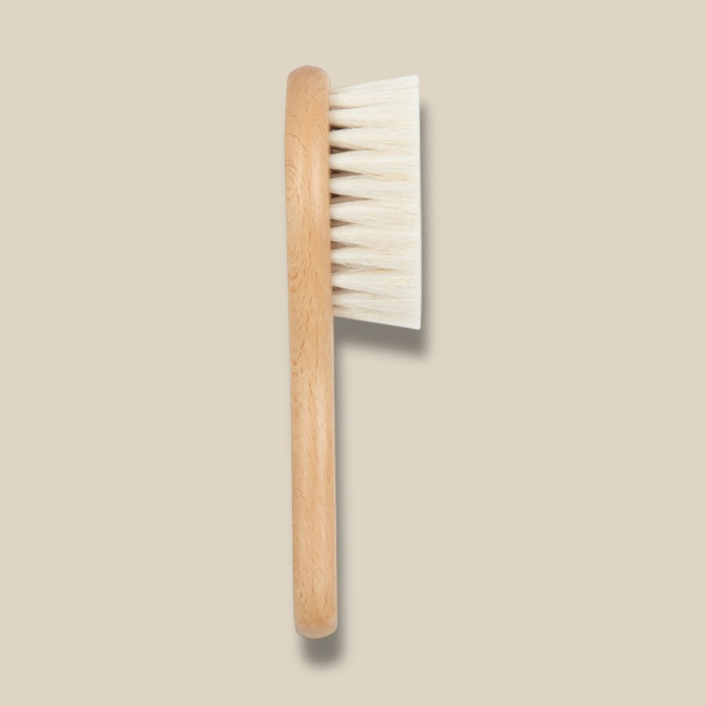 Le sue setole naturali sono abbastanza morbide e flessibili da non danneggiare il cuoio capelluto del bambino.